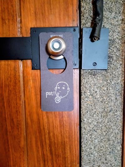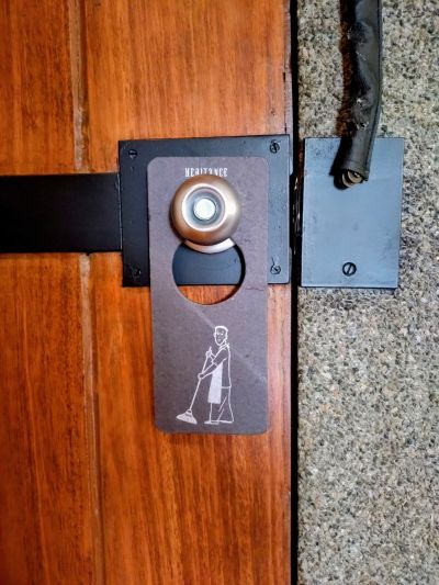 掃除してくださいとかの札はこんな感じで、ドアにも「ちゃんとテラスの鍵しめましたか?」の注意喚起の張り紙。鍵かけてないとサルが勝手に開けて部屋荒らされるので注意だよ!(これは部屋案内された時にスタッフからも言われた)