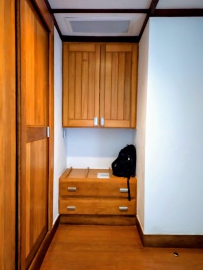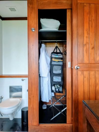 これは確かに便利!と驚いたのがクローゼットとバスルームの作り。部屋に入ると右手に荷物置き場があり、とにかく収納は十二分。で、正面がクローゼットになっている。