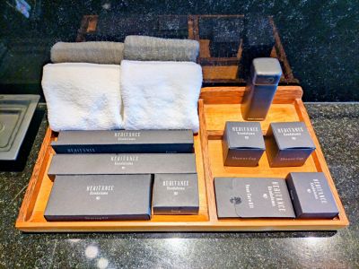 アメニティはホテルオリジナルのものが置かれている。右上のシャンプーなどは陶器で出来ており中身は詰め替え方式(エコ)