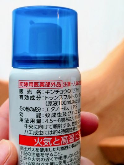 今回キャセイパシフィック航空利用だったが、このスプレーは機内持込可能だった(他の水物と一緒にジップロックに入れて)条件としては、100ml以内であること・殺虫剤ではない、点であろうか。一見殺虫剤に見えるが区分としては「防除用医薬部外品」となっている。ただこの辺は各航空会社で運用が違うかもしれないので、サイトで確認しょう。