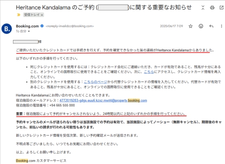 ご提供いただいたクレジットカードでは手続きを行えず、予約を確定できなかった旨の連絡がHeritance Kandalamaからありました。