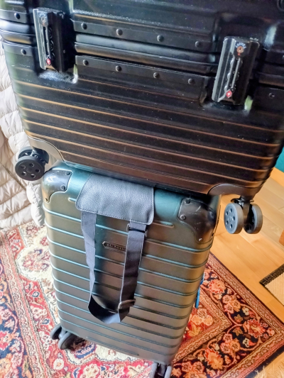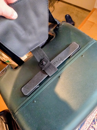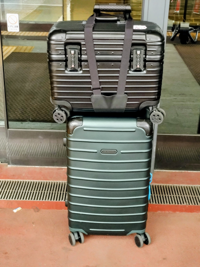 とはいえ、実際載せてみたら結構重量があって引っ張るの大変だったので、両手空いてるなら両手ゴロゴロ推奨。注意点としては、本来こんなでかいスーツケースを装着する想定ではないと思うので自己責任なのだが、段差でガツンと横からの衝撃があった時にスコンと上のスーツケースがすっぽ抜けたことがあったので気をつけて。