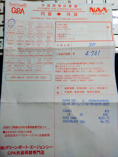 こちらのお店は成田空港内に複数店舗あるようであるが、私はエティハドのチェックインカウンター(T1北ウィング、Aカウンター)近くの店舗で両替してもらった。