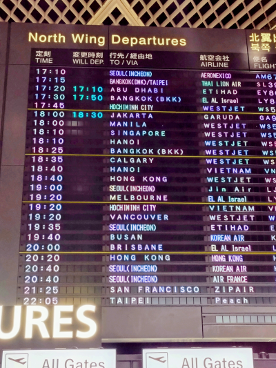 空港ついて案内板を見たら、出発予定時刻が10分早まっていた(17:20→17:10)遅れるのは見たことあるけど早まるってあるのね…なのでみなさん、空港ついたら変更ないか確認しようね(アプリなどオンライン上でも確認できると思うけど)