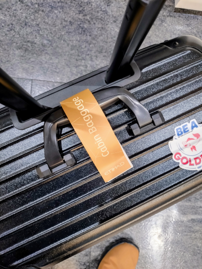 3時間前の14:10頃カウンターOPEN、ビジネスだけどなんだかんだ20-30分かかってチェックインが終わったのは14:45頃。機内持込のスーツケースにはこんなタグをつけてくれた(BE A GOLDFISHのシールはリッチモンドのテッドラッソショップで買ったやつ)持込荷物のサイズ採寸などはなかった(ビジネスだからなのか、見るからに小さいからなのかは不明)