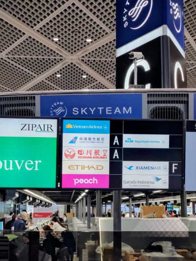 さてチェックインである。前日にオンラインチェックイン済だが預け荷物もあるのでカウンターに行く必要がある。エティハドのカウンターはどこかなーとこんなモニタを確認するも、まだ案内は出ず(今Aカウンターは中国南方航空と四川航空のチェックイン中)出発の3時間前になるとAと表示され、該当カウンターにエティハドのマークが出るのでレーンに並ぶ。