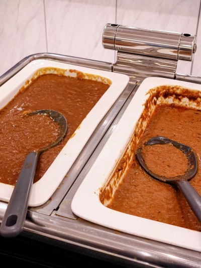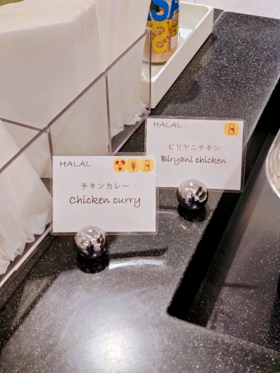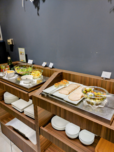 機内食は出るけど搭乗してすぐ寝るので、ラウンジで軽く食事を済ませておく。軽く一通りのものはあるという感じだが、私がうまい!と思ったのがカレーである。2種類あって1つはいわゆる欧風カレーで、もう一つはかなりスパイスがきいた本格的なチキンカレー(見た目的には分かりにくいけど、ぜんっぜん味違う)これがうまい。