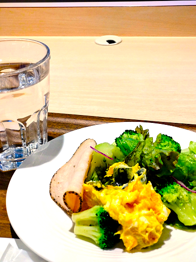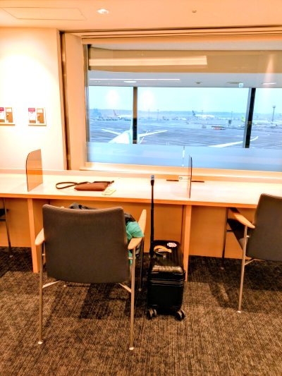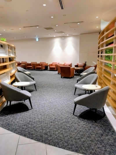 いざ入室。このラウンジについては事前に調べていて、シャワーは座席からスマホ予約とか見ていたんだけど、テーブルの上を見てもそれらしいものはない。スタッフに声を掛けるとシャワーは受付に申し出るタイプで、その際に搭乗券を預けてキーをもらうスタイルだった(シャワー浴びてる間、搭乗券は受付にあることになる)こういうのは適宜運用が変わるから、ネットを鵜呑みにせずスタッフに聞くのが一番早いなーと思った。