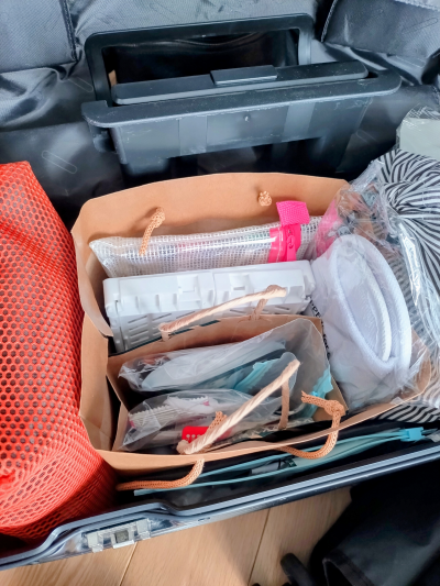 このスーツケースを使う時の私の荷造りのポイントは、このスーツケース用の収納グッズは必要ない。紙袋を活用せよ!だ。これが実際の写真である。ただの箱なので細々したもを入れると迷子になりがち。だけど紙袋を活用することで間仕切りにもなるし細かいものも分けられるし、ほぼ解決である。