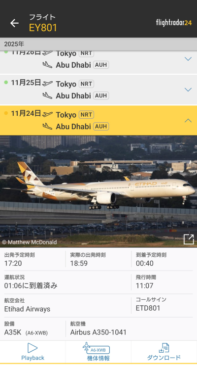 ちなみにこのEY801、手配前にフライトレーダー24で過去の運行状況を確認済なのだが(遅延・欠航が多い便は選ばない)20分位なら出発が遅れても定刻より早く到着するスタイルである。2025/11/24なんて出発1時間40分遅れてるのに定刻より26分遅れで着陸してる(実際私が乗ったエティハド便も全て定刻前着陸だった、すげーな)