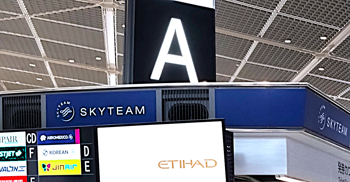 さてチェックインである。前日にオンラインチェックイン済だが預け荷物もあるのでカウンターに行く必要がある。エティハドのカウンターはどこかなーとこんなモニタを確認するも、まだ案内は出ず(今Aカウンターは中国南方航空と四川航空のチェックイン中)出発の3時間前になるとAと表示され、該当カウンターにエティハドのマークが出るのでレーンに並ぶ。
