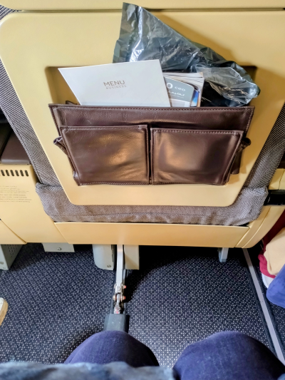 こちらの座席の注意点としては、前が壁ではないタイプの席でも足元に荷物が置けないという事である(前方座席の下にスペースがない。そのため離着陸時はカバンは上に収納しないといけない(エコノミーはわからん)