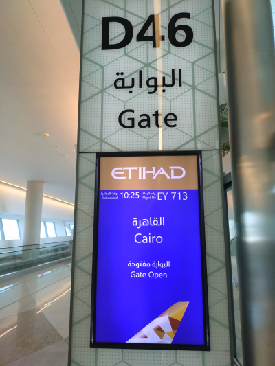 しばし空港内をうろうろし、本日の私の搭乗ゲートD46の位置を確認。いわゆる羽田成田のようなオープンな待合エリアではなく、このゲートに入る為に自動ドアがあり、待合エリアに入るには搭乗券とパスポートのチェックがある。へーアブダビってそんな感じなんだ、と思ったが全部のゲートがこうではない(復路は普通にオープンエリアだった)