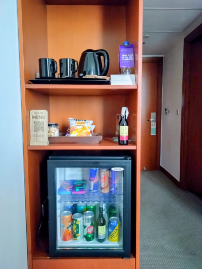 ペットボトルの水は毎日2本無料で配られ、冷蔵庫のコーラなどのソフトドリンク類は確か無料だったはず(飲んでないけど)